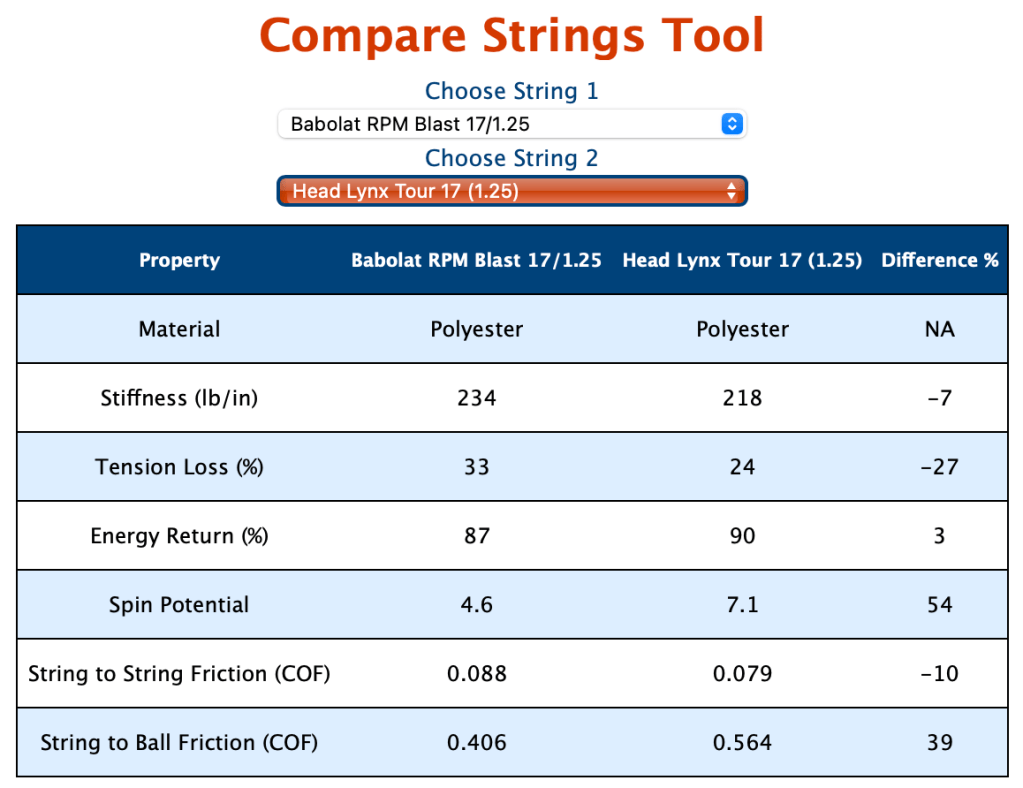 In the above example, I have chosen Babolat RPM Blast (1.25 mm gauge) and HEAD Lynx Tour 17 (same gauge):