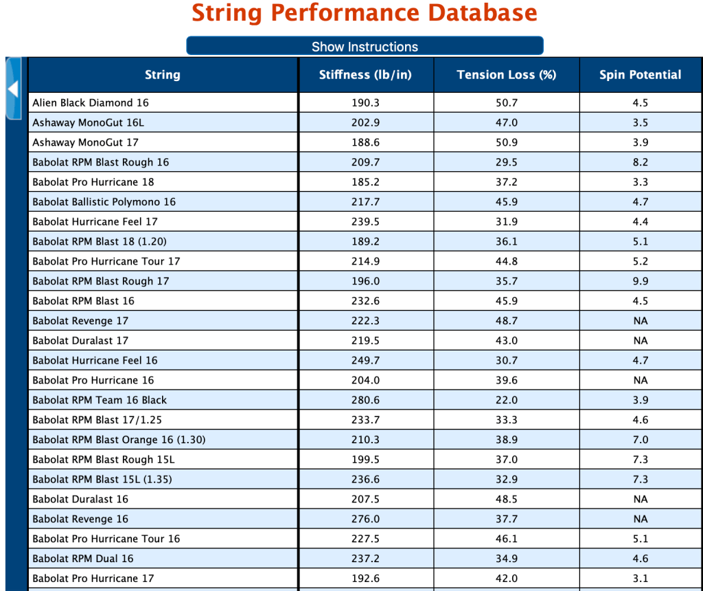 Tennis Warehouse maintains a string testing database. It provides invaluable information about strings. You can access the database here: https://twu.tennis-warehouse.com/learning_center/index.php