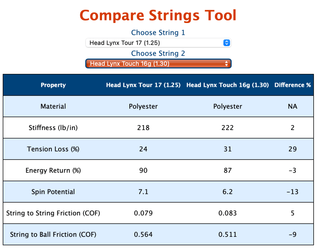 For example, I use HEAD’s Lynx Tour 1.25mm (mains) and Lynx Touch 1.25mm (cross). I added the Lynx Touch to increase the comfort and power, and it is a softer string by feeling. The database suggests, that Lynx Touch 1.30mm is more like the Lynx Tour, but I guess 0.05mm can make a huge difference, maybe?